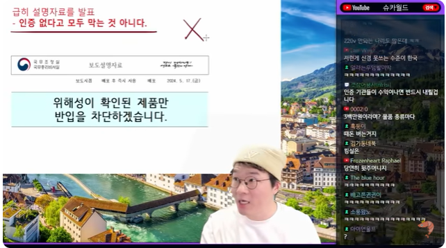 (15:14) 하죠 자 요런 까지가 현재까지 였고 하지만 그래서 열을 내잖아요 이렇게 아이 말이 되냐 이게 이런게 있고 말이 되냐 그러니까 정부가 급히 설명 자료를 배포했습니다 인증이 없다고 모두 막는 것 아니다 유튜버가 나불대는 거 믿지 마라 저 저 그렇게 얘기한 적 없습니다 모두 막는 건 아니고 위해성이 확인된 제품 검사를 해봤는데 위해성이 확인 됐더라 그건 확인되면 당연히 막겠지 지금도 위해성이 확인되면 막는거 아 죄송합니다 죄송합니다 그죠 여튼 위해성에 확인된 제품만 이제 반입을 하는 거지 이거 오해다 그래고 발표했습니다 위해성이 확인된 제품은 당연히 지금 안 막나 뭐 하여튼 어떠한 안정 장치도 없다 지금 국내에 반입되고 있는 상황이 국민의 건강과 안전을 최우선으로 보여야 되기 때문에 그 목적 하나로 5월 16일 관련 대책을 발표한 거 그 외에 목적은 없었고 80개 품목 전체에 대해서 해외 직구가 당장 금지되는 거 아니다 실제로 위해성이 확인된 제품만 반입을 차단하고 그것조차 충분한 공론화를 거쳐서 합리적인 방안을 제시하겠다는