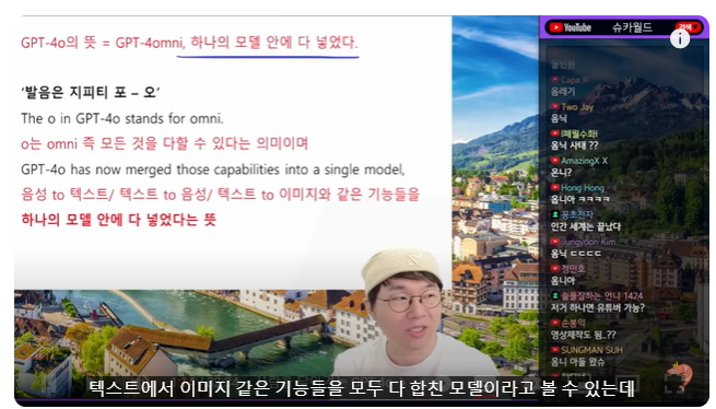 (00:07) 자, 오늘의 첫 번째 주제는 쉽고 재밌는 거 바로 GPT-4o 요거 GPT-4 제로라고 읽으시면 안됩니다 GPT-40이라고 읽는 분도 봤는데 40 아니에요 4 제로 아닙니다 4o입니다 알파벳 o예요 5월 13일날 GPT-4o가 공개가 됐습니다 보셨죠? 라이브도 했는데 CTO 미라 무라티 누나가 나와서 직접 실시간 방송을 하면서 GPT-4o를 새로운 AI 모델로 공개를 했습니다 아실 분들은 다 아시지만 GPT-4o는 뭐의 약자냐? 바로 GPT-4 omni입니다 omni가 뭡니까? 옴니아 아니고요 모든 것을 다 넣었다 omni로 막 넣었다 이거잖아요 omni를 넣었기 때문에 GPT-4o는 기존에는 이미지 AI, 텍스트 AI, 음성 AI, 그림 그리는 AI 이렇게 다 달랐잖아요 그 모든 것을 하나의 모델 안에 다 넣었다는 뜻입니다 GPT-4o라고 읽어야 되고 GPT-4 omni라고 읽어야 됩니다 한마디로 음성에서 텍스트, 텍스트에서 음성