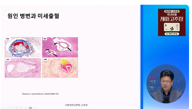 (20:22) 재는 걸로 뇌 손상이 어느 정도 있는지 알 방법은 없어요 그 더더 정상 기능을 하고 있다면 대부분 정상 기능을 하죠 예 그런데 이제 우리가 진단 기구가 굉장히 발전되면서 뭐 방귀가 잦으면 화장실 간다라는 담이 있듯이 뭔가 이제이 혈관이 손상돼서 비실비실 혈액이 세워 나온다는 거를 우리가 MRI 볼 수가 있어요음 그걸 이제 미세 출혈이라고 하는데 예 이분이 이제 대표적이 까맣게 보이는게 MRI 그래는 이제 특성에 따라서 혈액이 이제 까맣게 보이는게 일반적인데요 시티는 하얗게 보이지만 그래서이 혈 혈액이 터져서 다 춘 너무 약하게 터져가지고 주변 조직하고 금방 평이 되는 바람에 요만큼 터지고 말아 사이즈가 뭐 2mm 3mm 뭐 이렇게 근데 이제 MRI 굉장히 과장하는 영상이라서 그분을 굉장히 크게 보여줘요 아 저런 걸 미세 출혈이 있는 환자를 보게 되면 혈관이 지금 굉장히 방귀를 많이 끼고 있다 굉장히 위험한 상태군요 예 이분은 꽤 많은 겁니다 굉장히 많은