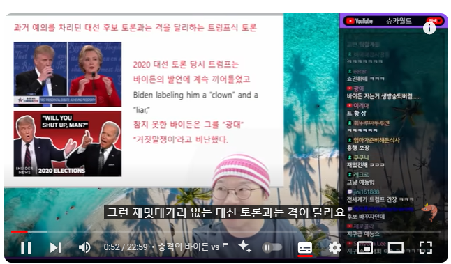 (00:07) 자, 마지막 주제입니다 이거는 뭐 재밌는 주제예요 항상 마지막은 재밌는 걸로 끝내죠 바로 바이든 대 트럼프 지난주에 있었던 1차 대선 토론 사실상 글로벌 모든 언론을 덮었던 바로 그 주제입니다 이게 뭐 우리나라 언론도 다 덮었죠 왜냐? 보시면 알겠지만 한국 시간 기준 금요일 오전 생방송 대선 토론이 시작됐습니다 트럼프 대 바이든 미국 대선이 D-130일 4개월밖에 남지 않았어요 그리고 이게 흥행이 될 수밖에 없는 게 트럼프가 등장하는 대선 토론은 무조건 흥행을 합니다 역대 최고 대선 토론 시청자 수가 트럼프 대 클린턴이었어요 왜냐? 재밌거든 트럼프가 대선 토론을 하면 재밌습니다 이 어르신이 대선 토론을 하면 그런 점잖은 말만 하고 정책만 하는 그런 재밋대가리 없는 대선 토론과는 격이 달라요 서로 뭐 삿대질과 디스가 난무하기 때문에 2020년 대선을 생각해보면 트럼프가 바이든 발언에 계속 끼어듭니다 바이든이 나중에 참지 못하고 막 라이어 뭐 그런 별소리를 다 하는데 그 중에서 가장 유명했던 장면 그게 바로 Will you shut up, man?