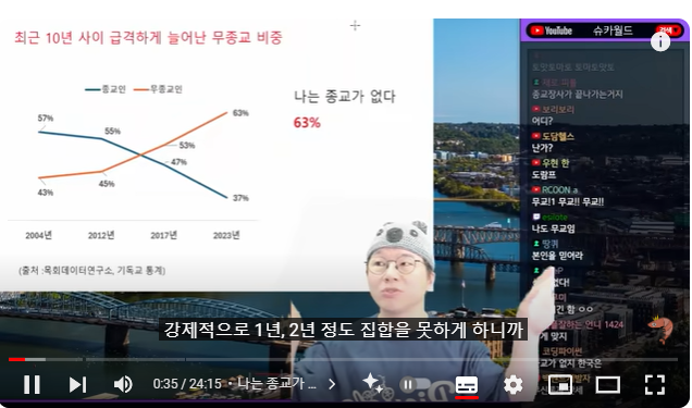 (00:07) 마지막 네 번째 주제 세계 최강 유교국가에서 벌어지고 있는 일이라는 주제를 갖고 왔는데 어딘지는 누구나 다 아실 거고 자 봅시다 본격적인 주제를 얘기하기 전에 먼저 서론을 시작을 해보면 최근 10년 사이 우리나라에서 무종교가 급격하게 늘어나고 있다는 건 이제 누구나 다 아는 사실입니다 특히 코로나 이후에 급격하게 치솟고 있어요 이게 진짜 경험이라는 게 무섭다고 코로나 때 종교 시설로 못 갔잖아요 교회도 성당도 절도 사람들이 많이 못 모이게 하고 강제적으로 1년, 2년 정도 집합을 못하게 하니까 이게 아웃 오브 사이트, 아웃 오브 마인드라고 내가 안 가게 되다 보면 무종교로 가는 비중들이 은근히 센 것 같아요 안 그래도 무종교 비중이 늘어나는 와중에 코로나가 직격탄을 맞으면서 현재 우리나라에 종교가 없다가 63%입니다 대단히 올라갔다고 할 수 있고요 게다가 앞으로 더 낮아질 거라고 생각하는 이유는 연령대가 낮을수록 종교인의 비중이 급격하게 내려갑니다 이게 2017년과 2023년이니까 중간에 코로나가 꼈잖아요 반토막 났어요 20대는 16%야