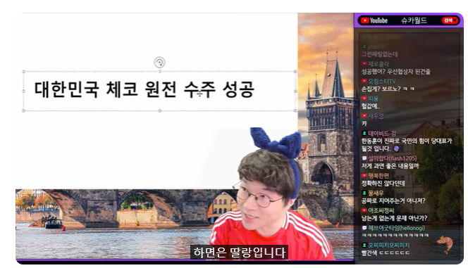 (00:07) 자, 오늘의 내용은 아주 좋은 내용이 있고요 약간 민감한 내용이 있는데 일단 아주 좋은 내용부터 대한민국이 체코 원전 수주에 성공했다 어 좋은 내용인데 야 이러면 정부의 앞잡이요? ㅎㅎㅎㅎ 그렇게 생각하시면 안됩니다 우리가 잘했다고 근데 만약에 이걸 또 안 해 그러면 저 새끼 왼쪽이여서 안 하는 거 아닌가요? 심지어 그런 걸로 유튜브 영상 만들고 저 놈이 저거 안 하는 걸 보니까 왼쪽입니다 하면은 딸랑입니다 안 하면 뭐 그러니까 이 파란색과 빨간색의 넓이가 다르다 뭐 이런 걸로 항의하시는 분들은 좀 그쵸? 그런 뜻이 아니다 자 그런 뜻이 아니다 좋습니다x2 그런 뜻이 아니라는 겁니다 국가에 좋은 일이니까 한번 살펴보도록 하겠습니다 대한민국이 체코 원전 수주에 성공했다 뉴스에만 보면 24조 이런 얘기를 하고 있어요 이걸 한번 천천히 살펴보겠습니다 원전을 수주했다