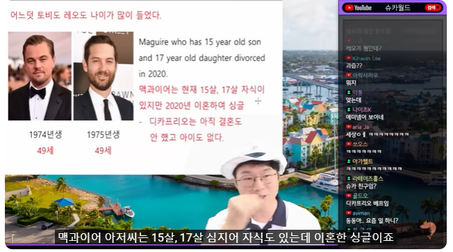 (00:07) 자, 마지막 주제는 이겁니다 신문에서 많이 나왔죠 천하의 레오나르도 디카프리오도 피하지 못했던 것이 있었다 뭘까요? 피하지 못했던 것 디카프리오조차 피하지 못했던 것 나이냐? 아닙니다 보시면 알게 되는데요 자, 현재 레오나르도 디카프리오 형은 지중해에서 아주 즐거운 여름휴가를 보내고 있습니다 현재 만 49세, 좀 있으면 50세예요 생일 지나면 50세인데 여자친구하고 즐겁게 보내고 있는데 여자친구의 나이가 26세 비토리아 세레티 우리 세레티 양과 즐겁게 놀고 있습니다 참고로 그 옆에는 원조 스파이더맨으로 불리는 우리 토비 맥과이어 맥과이어 아저씨도 같이 휴가를 즐기고 있다는데요 맥과이어 아저씨의 여자친구는 24살 베베테 스트리보스 하여튼 24살 여자친구랍니다 그런데 이게 진짜인가? 토비 맥과이어 아저씨의 나이가 맞아요? 자료조사하는 친구가 만들어 오긴 했는데 49세였어? 아 잠깐만 이상한데? 제 기억에는 25살인데? ㅎㅎㅎㅎ 잠깐만 이상한데 49세 맞나? 자료가 이상한데?