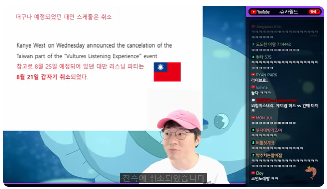 (00:07) 그 다음 소식은 칸예 웨스트의 내한! 내한 사건에 대해서 조금 얘기해보도록 하겠습니다 야, 이게 또 커뮤니티를 뜨겁게 달궜어요 아시는 분은 아시지만 아마 모르시는 분도 계실테니까 제가 상세하게 소개해드리도록 하겠습니다 자, 8월 3일날! 칸예 웨스트가 드디어 새로운 앨범을 발매했습니다 원래 3월달에 발매하겠다고 했었는데 계속 미뤄왔었죠 근데 이걸 보면 아마 슈카월드를 보시는 많은 분들이 이렇게 생각할거예요 칸예 웨스트 이름은 들어본 것 같아 도대체 뭐하는 사람이냐? 처음 들었는데 무슨 슈카월드 주제로 갖고 와 미국에 있는 아티스트가 음반 낸 것 가지고 참고로 칸예 웨스트는 슈카월드에 이미 여러 번 나왔죠? 가수로 나온 게 아니라 논란으로 나왔습니다 지구상에서 가장 논란이 많은 래퍼죠 테일러 스위프트하고 악연으로 유명하고요 미국 대선에 출마한 걸로 유명하죠 해피벌스데이당 농담이 아니고 생일 당 그리고 킴카다시안 유명한 걸로 유명한 분과 아이가 있는 지금은 이혼했지만 부부였던 걸로 유명하고 반유대주의 외치다가 아디다스에서 쫓겨난 거 이런 걸로도 슈카월드에 많이 등장한