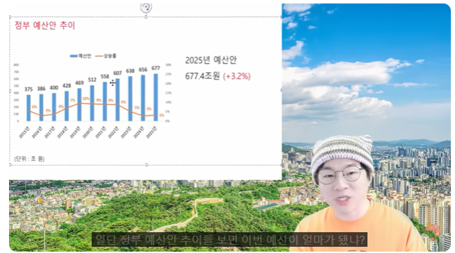 (00:07) 여러분 안녕하세요 이번 시간은 아주 중요한 시간이죠 2025년 정부 예산안에 대해서 알아보는 시간을 갖도록 하겠습니다 예산안 이게 왜 중요하냐? 당연하지요 우리 세금이, 내 세금이 어떻게, 어디에 쓰이는지 한번 알아보는 시간을 갖도록 하겠습니다 생각보다 우리한테 밀접한 내용이니까 한번 들어보시면 내 생각과 같은지 생각해보시기 바라겠습니다 일단 정부 예산안 추이를 보면 이번 예산이 얼마가 됐냐? 2025년 예산안 677조 원을 찍었습니다 2015년에 우리나라 예산안이 375조였거든요 10년 만에 300조가 늘었습니다 거의 매년 30조씩 늘어난다고 보시면 되고요 물론 이번 예산안은 뒤에 있는 주황색이 상승률인데 상승률이 3% 정도입니다 우리나라가 많이 예산안이 오를 때는 무려 10%, 9% 이렇게 높게 오를 때도 있었기 때문에 3.