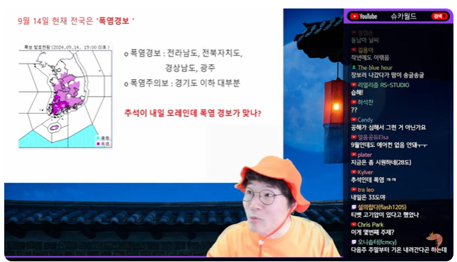 (00:07) 자 오늘의 메인 주제 추석이니까 그리고 또 제가 느끼기에 좀 이상해서 저만 그런가 아니 9월 날씨가 이게 맞습니까 어 이게 이상해 야 이게 맞아 9월 날씨가 좀 더워도 너무 더운 거 아닌가 그냥 조금 더운게 아니라 뭔가 이상해 뭔가 폭염은 언제나 있었지 폭염은 언제나 있고 코드다는게 아니라 9월 중순인데 아 이게 뭔가 이상해요 뭔가 저만 느끼는게 아닌 거 같은게 9월 14일 지금 현재 전국이 놀랍게도 폭염 경보다 폭염 경보 주의보도 아니야 경보 게다가 나라 전체가 그래요 거의 대부분이 그래 강원 도정도 제외하고 수도권 엄청 덥잖아요 폭염 경보도 아니야 남쪽에 전라도 뭐 이쪽 경산남도 이쪽은 지금 서울보다 더 더워 아마 거의 찜통더위를 느끼시지 않을까 생각하는데 추석이에요 추석 추석이 내일 모래 진짜 내일 모래야 내일 모래 내일 모데 폭염 경보가 맞냐 이런 적이 있었냐 참고로 폭염 경보는 1 최고 체감 온도가 35도 씨일 때 내리는 겁니다 9월 중순