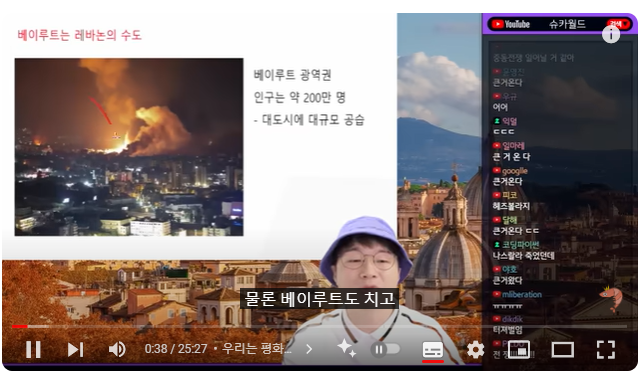 (00:07) 자, 요번에 세 번째 주제는 원래 주제 딴 거 만들고 있었는데 갑자기 어젯밤에 얘네들이 왜 토요일날 딴 주제 다 만들었었는데 격랑에 빠지는 중동 얘기를 한번 해보겠습니다 현재 이스라엘이 레바논의 수도 베이루트에 대규모 공습을 이미 일주일 동안 했고 어저께도 정말 대규모 공습을 했는데 헤즈볼라의 헤드쿼터 거점 본부를 공습했다 라는 얘기가 나오고 있어요 참고로 베이루트에 있는 헤즈볼라의 거점 본부인데 베이루트는 레바논의 수도입니다 베이루트를 공격하고 물론 베이루트도 치고 그 남쪽인 헤드쿼터를 쳤는데 놀라운 건 그래도 남의 나라 수도인데 여기에 가서 이게 지금 베이루트의 모습이에요 가서 공습을 때렸어 베이루트 광역권 인구가 200만입니다 지금 사망자가 800명을 넘어갔대 대도시에 2차 세계대전도 아닌데 비행기가 와서 떨구고 가 그것도 한두 대가 아니고 떨구고 가는 게 지금 현재 베이루트와 레바논의 오늘이라고 할 수 있습니다 그리고 토요일 날 정말 대규모 공습을 때렸는데 그때 직전에 유엔에서 네타냐후 이스라엘 총리가 연설을 했어요 좀 길게 보여 드리겠습니다