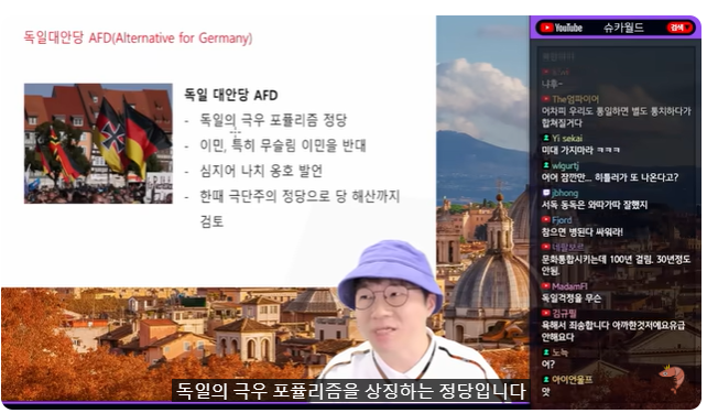 (01:07) 심지어 나치를 옹호해 물론 옹호한 다음에 칼 맞고 옹호한 다음에 칼 맞고 하는데 툭하면 해 그런 발언을 할 정도로 굉장히 극우 그 자체예요 당 해산을 해야 되는 거 아니냐 이런 얘기가 나올 정도로 굉장히 강한 당인데 얼마나 강하냐 AFD가 저 유럽의 선거에서 승리한 다음에 유럽의회 극우 정당 ID라는 데 들어갔어요 유럽의회에도 극우 정당이 있어요 자기도 극우 정당이니까 극우 정당의 모임에 들어갔어 근데 거기서 퇴출당했어 극우 정당이 극우 정당 모임에 들어갔는데 왜 퇴출당합니까? 뭔 소리를 했냐면 요 아저씨가 했는데 나치 무장 친위대가 모두 범죄자인 것은 아니다 근데 문제는 유럽의 극우 정당들은 다 나치 침략을 받은 나라들이잖아 다 나치 침략을 받거나 지들이 추축국이거나 둘 중에 하나예요 근데 야 나 극우니까 들어갈래 하는 애들이 나치가 범죄자는 아니다 이딴 소리를 하니까 여기서도 못 받아주겠는 거야 아무리 우리가 극우여도 똥, 오줌은 가린다 그래서 거기서도 퇴출당했던 그런 정당이라고 할 수 있는데 근데 독일에서 나치를 가장 강하게 반성하는 독일에서