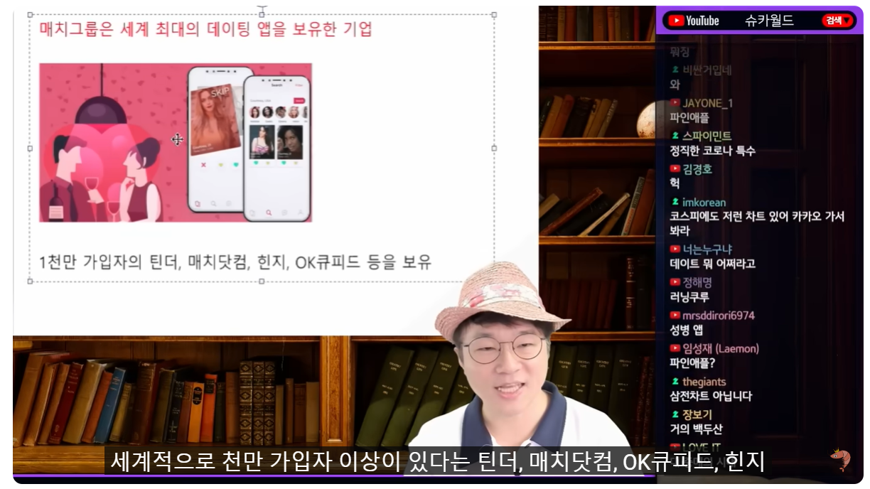 (00:07) 세번째 주제는 정말 깜짝 놀랄 주제입니다 난 이게 미국에서도 이럴 줄 몰랐어 그게 뭐냐? 데이팅 앱 대신에 뜨는 이것이 있습니다 미국 얘기입니다 미국 얘기 요즘 데이팅 앱 예를 들면 대표적으로 글로벌에서는 매치그룹이 있습니다 매치그룹이 코로나 때 너도나도 데이팅 앱을 하니까 엄청나게 올랐어요 몇 배입니까? 7배, 8배 올랐어 가격이 코로나가 끝난 다음에 어떻게 됐냐? 다시 돌아왔어 와악! 하고 떨어졌는데 추락하는 것은 날개가 없다는 속도로 떨어졌어요 마이너스 80%로 떨어졌습니다 왜 이렇게 떨어졌는지를 보여드릴 텐데 참고로 매치그룹은 다 아시리라 생각하지만 세계적으로 천만 가입자 이상이 있다는 틴더, 매치닷컴, OK큐피드, 힌지 이런 글로벌 데이팅 앱을 보유한 기업이에요 얘들이 잘 나갈 때가 있었죠 저 그룹이 주가가 엄청 올라왔다가 쭉 내려갔다는 건데 외국 사람들은 예를 들면, 이번에 파리올림픽 했잖아요 파리올림픽 했을 때 제일 먼저 깐 게 이거였어, 이거 농담이 아니라 선수들이 외국 선수들은 가면은 전부 다 틴더 하고 있어요