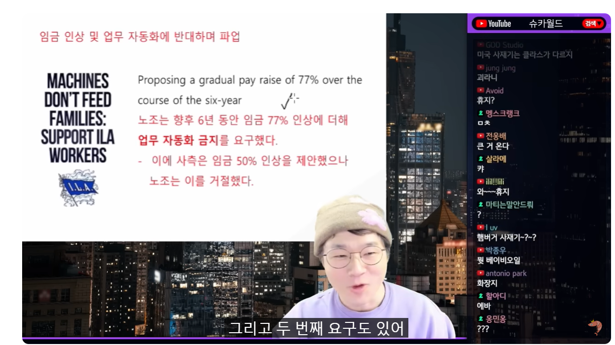 (00:07) 자, 마지막 얘기는 미국식 사재기 얘기를 한번 드리도록 하겠습니다 이것도 재밌어요 미국식 사재기 얘기는 뭐냐? 지난 10월 1일 예전에 말씀드렸지만 미국 동부항만에 파업이 일어났습니다 1977년 이후에 사상 최초의 일인데 그때도 한번 보여드린 것 같긴 한데 노조의 요구는 6년 동안 임금 77% 인상이에요 부럽다 77% 부러워 이거 보면서 좀 얼척이 없긴 했는데 그리고 두 번째 요구도 있어 업무 자동화 금지 기계 사용 금지입니다 정해진 기계가 있어요 숫자가 있어 그거 이상 넘는 걸 막는 거야 특정 숫자 이상의 기계는 금지야 사측은 6년에 임금 50% 이상을 제안했지만 노조가 칼같이 거절했습니다 아니 우리를 뭘로 보고 지금 50%래? 노조가 이렇게 배짱을 부릴 수 있었던 이유는 역시 이제 나왔지만 당연히 미국 대선이 48대 48이거든요 여론조사는 물론 선거인단으로 가면 트럼프가 유리하다는 분석도 있어요 하지만 어쨌건 여론조사는 48대 48입니다 트럼프가 약 5위일지 모르겠는데 까봐야 알겠지만