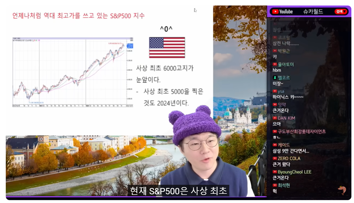 (00:07) 자, 오늘의 마지막 주제는 한동안 안 가져왔었는데 왜냐면 제가 주식은 지금이랑 프로 하다 보니까 하도 얘기를 많이 해서 안 가져왔었는데 도저히 안 가져올 수 없는 그 주제 SK하이닉스가 역대 최대의 실적을 기록했습니다 주가가 쭉쭉 오르고 있죠 그런데 삼성전자는 분위기가 조금 안 좋아요 어떤 일이 있었는지 얘기를 한번 해보도록 하겠습니다 자 이 얘기를 하기 전에 미국의 S&P500 지수 미국의 종합주가 지수죠 S&P500 지수는 언제나처럼 역대 최고가를 쓰고 있습니다 지금 일요일 방송을 하고 있는데 언제가 제일 비쌌냐? 어저께가 제일 비쌌어요 미국으로 치면 지난 금요일 지난 금요일이 S&P500의 역대 최고가였습니다 언제가 제일 비싸냐? 지금이죠 현재 S&P500은 사상 최초 6천 고지가 눈앞입니다 5,878이에요 참고로 5천도 오래 찍었어요 미친놈들인가 봐 여기 찍은 게 5천이에요 5천을 오래 찍었는데 올해 6천을 찍으려고 그래 참고로 4천도 작년인데 아 이걸 보면 S&P500이 최근 1년에 몇 프로 오른지 아십니까?