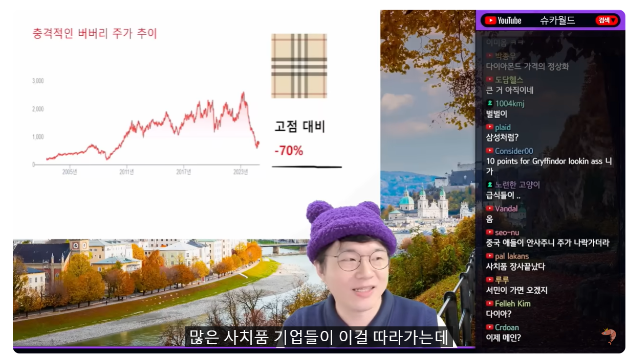 (09:24) 사치품의 전략이고 그런데 중산층에 상류층의 꿈을 팔아야 되는데 중산층이 살 수 없는 가격까지 올라갔다는 거죠 그러면 상류층이 사줘야 돼 상류층이 그걸 사겠냐 말이 웃기긴 한데 초상류층에 보기에는 그걸 안 사 근데 중산층이 사기엔 비싸 그러니까 가격이 애매해졌다는 거예요 누구를 대상으로 이 전략을 해야 되냐 특히 버버리와 같은 초대형이면서 럭셔리 중에는 중저가라는 말이 웃긴데 상류층에서 보면 가격이 좀 낮은 이 브랜드들은 입지가 애매해졌다는 얘기를 하는 겁니다 그래서 버버리보다는 루이비통이 좀 잘 버텼어요 고점 대비 28% 하락 잘 버틴 겁니다 왜냐하면 여기는 완전 부유층을 상대하는 브랜드도 있었고 대중을 상대하는 브랜드도 있었는데 안에서 좋은 것도 있고 나쁜 것도 있다는 거죠 대중을 상대하는 브랜드들이 굉장히 어려움을 겪었고 하지만 루이비통은 이렇게 얘기합니다 현재 명품 시장 침체는 슈카 네가 얘기하듯이 몇 년간의 가격 인상과는 아무런 관련이 없다 비싸서가 아니다 비싸서가 아니야 게다가