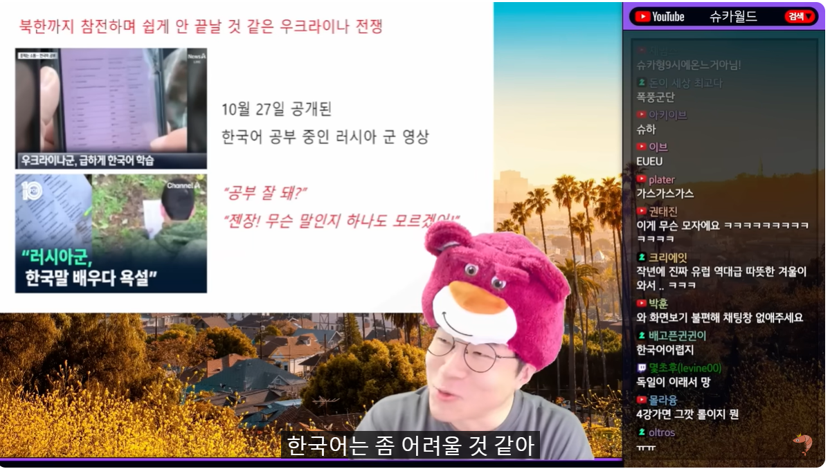 (00:47) 욕부터 배우겠지 씨에 발 달린 거 이런 것부터 배우지 않을까 도그 베이비 이런 건 쉽게 배우겠지만 나머지는 쉽지 않지 않을까 생각을 하고 그리고 얼마 전에 우크라이나 대표단이 한국에 온다고 하죠 그리고 젤렌스키가 북한과 며칠 내 교전할 것으로 보이는데 한국과 무기 지원에 대해 이야기하겠다 이런 말했습니다 우리 보고 북한군이 러시아 도와주니까 남한은 자기네들을 도와달라 가장 원하는 것은 방공 시스템과 화포다 방공 시스템이라면 요거 신문에 요거 많이 나오더라구요 한국형 패트리엇 천궁 중거리 지대공 미사일 빵 싸서 날아오는 미사일을 격추시킨다는 거죠 그리고 대전차 방어용 현궁 요거 사람이 차 위에 탄 거고 내리면 어깨에 놓고 쏘는 거 있죠 우리로 치면 옛날 박격포 어 저거를 이렇게 들고 대전차니까 거의 탱크에다가 빵 쏘는 이거 달라는 건데 보병용이니까 엄청 무겁겠다 근데 이거 무게가 얼마나 될까 한 사람이 이거 들고 다닐 수 있나? 현궁? 딱 봐도 크기가 장난이 아닌데? 이거를 젤렌스키가 달라고 했다는 건데