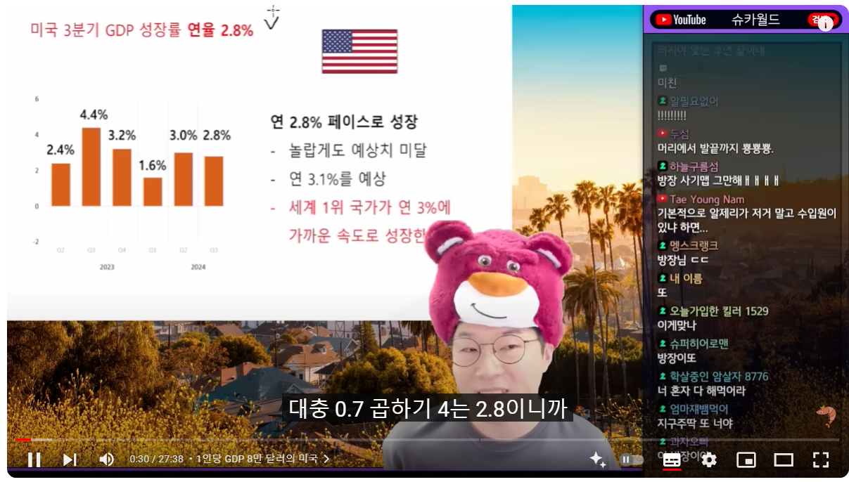 (00:07) 두 번째 주제는 나 홀로 레벨업이라는 주제를 갖고 왔습니다 어느 나라가 레벨업을 하고 있냐 이거 요즘에 커뮤니티에서 많이 돌아다니던데 미국이 3분기 GDP 성장률을 발표했습니다 연율 2.8%가 떴어요 참고로 연율이라는 거는 이번 분기처럼 성장하면 1년에 2.8% 성장한다는 거니까 대강 한 분기로 치면 분기에 0.7% 정도 성장했다고 보면 됩니다 대충 0.7 곱하기 4는 2.8이니까 근데 미국의 성장률을 보면 참고로 연율 2.8%도 예상치 미달이에요 예상치는 얼마였냐? 이 미친 나라는 예상치가 연 3.1%야 그러면 미국 저 큰 나라가 기본적으로 3% 성장을 기대한다는 거죠 세계 GDP 1위 국가가 연 3%에 가까운 속도로 성장을 한다 참고로 대한민국은 얼마였냐? 전년 대비 1.