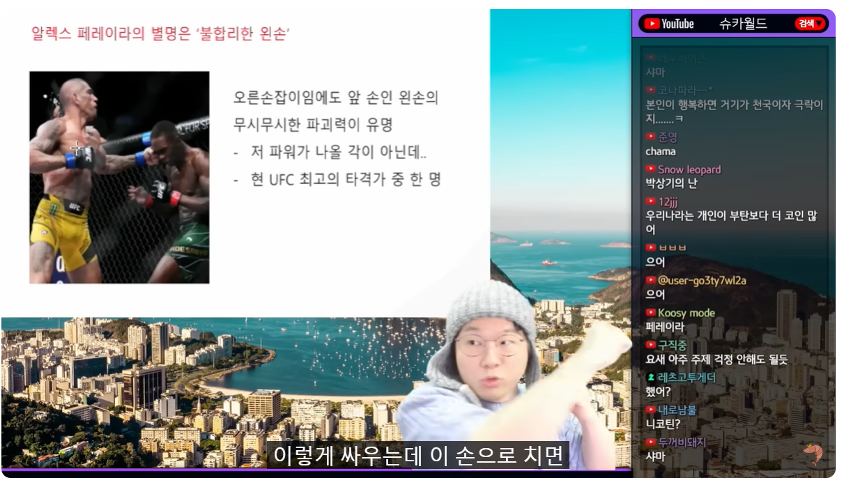 (00:07) 두 번째 주제는 제가 한 UFC 선수를 보여드릴 텐데 UFC 선수가 주제가 아닙니다 그가 사용하는 그것이 주제가 되겠습니다 이게 뭘지 한번 알아보도록 하겠습니다 얼마 전에 대한민국을 방문했던 UFC 챔피언이 있었습니다 미들급 라이트헤비급 미들급 라이트헤비급 챔피언 알렉스 페레이라 불합리한 왼손이라고 부르죠 왼손으로 치면 다운되는 이 챔피언 얘기를 할 거냐? 그건 아니고 이 챔피언이 어떤 걸 사용을 했습니다 그걸 한번 볼 텐데 되게 바쁘게 세미나도 하고 사인회도 하고 한국 팬들과 만났는데 참고로 알렉스 페레이라 저처럼 이제 이종격투기 많이 보시는 분 누구나 다 알겠지만 왼손이 유명하죠 오른손잡이야 그래서 이렇게 싸워 이렇게 싸우는데 이 손으로 치면 애들이 다 다운되는 걸로 앞 손인데도 왼손에 무시무시한 파괴력이 유명한 별명이 불합리한 왼손이죠 아주 바쁘게 지냈습니다 11월 17일에 방한을 했는데 이렇게 인천공항에 입국을 했는데 어떻게 다들 다 아셨는지 인천공항 도착한 다음에 팬들이 와~~ 쫙 모여갖고 페레이라를 반겨줬고 페레이라도 영상을 보면 나가다가