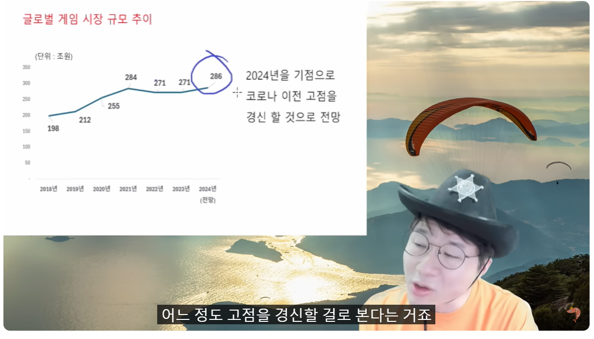 (00:07) 자, 여러분 안녕하세요 이번 주제는 어려움을 겪고 있는 대한민국 게임 산업이라는 주제로 갖고 왔습니다 사실 뭐 요즘에 우리나라 산업이나 주식이 어려움을 겪지 않고 있는 게 어디 있겠냐만 게임주의 분위기가 요즘 그렇게 좋지가 않죠 예를 들면 왼쪽에 보이는 차트가 코스피 게임 ETF 주가 추이입니다 게임 산업 전체를 ETF의 주가 추이를 볼 수 있는데 코로나 이후 고점 대비해서 사실상 반토막으로 빠졌다고 볼 수 있습니다 우리나라를 대표하는 상장 게임사들의 주가가 대부분 다 반토막 정도라고 보시면 되고요 이 코로나 때는 굉장히 좋았는데 그때 이후로 회복을 못하고 있죠 반면에 글로벌 시장을 보면 글로벌 게임 ETF 히어로 ETF가 있는데 물론 여기도 코로나 당시 고점을 회복하지 못한 건 사실입니다 하지만 완만하게 올라서 지금은 그때 고점의 한 80% 정도까지는 회복을 했어요 더구나 이건 시가총액이고 글로벌 게임 시장 규모를 보면은 2024년 올해를 기점으로 코로나 이전 고점을 경신할 걸로 전망을 하고 있습니다 한마디로 우리나라 게임주들은 아직 주가를 회복하지 못했는데