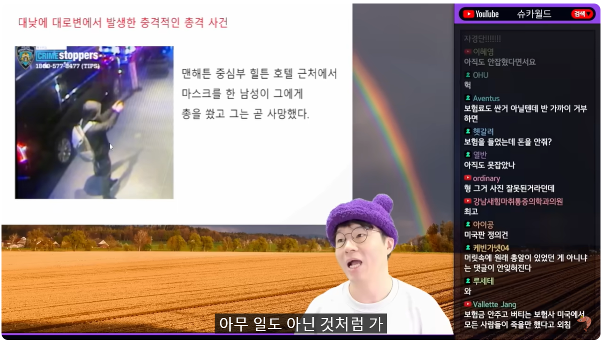 (00:07) 이번 주제는 미국을 뒤흔든 살인사건 미국에서 가장 뜨거운 사건 중 하나가 아닌가 생각하는데 이게 어떤 일이 있었냐? 미국 최대 보험사의 CEO가 평일 아침 뉴욕 한복판에서 살해당하는 끔찍한 사건이 있었습니다 12월 4일 수요일 대낮 뉴욕시에서 유나이티드 헬스케어 미국 최대 의료보험사입니다 여기 CEO가 뉴욕시에서 총격을 맞아서 사망을 했습니다 대낮에 정말 대로변에서 영상도 있어요 그냥 갑자기 남성이 오더니 쓱쓱쓱 오더니 아무 일도 아닌 것처럼 총 꺼내 갖고 쏴요 정말 아무 일도 아닌 것처럼 빵빵 쏘더니 아무 일도 아닌 것처럼 가 이게 맨하튼 중심에 있는 호텔에서 일어난 사건인데 정말 영화와 같다는 평가를 많이 듣고 있습니다 검은색 옷을 입고 미리 기다리고 있다가 소음기가 장착된 총을 든 상태로 그대로 발사해서 CEO가 돌아가시는 그런 일이 있었는데 게다가 위치가 여기가 어디냐면은 여기가 센트럴파크예요 범인이 총을 쏜 데가 여기입니다 여기서 총을 쏘고 유유히 걸어서 이렇게 맨하탄을 가로지른 다음에 센트럴파크로 빠져서 갔어요 더 놀라운 건 안 잡혔습니다