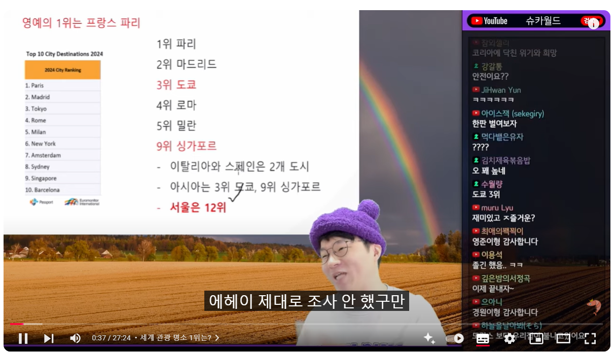 (00:07) 프랑스에 닥친 위기와 희망이라는 주제로 한번 얘기를 해보도록 하겠습니다 자 봅시다 세계에서 가장 매력적인 도시는 어디일까 아까 답은 다 했습니다 얼마 전에 나왔어요 2024년 세계에서 가장 매력적인 도시 100대 도시를 유로모니터가 발표를 했습니다 자 과연 서울은 몇 위였을까요? 1위는 누구였냐 영예의 1위는 프랑스 파리였습니다 세계에서 가장 매력적인 도시 2위가 마드리드 3위가 도쿄 에? 서울이 12위야 에헤이 제대로 조사 안 했구만 잠깐만 기준이 뭐였지? 제대로 조사를 안 했어요 이것들이 경제, 비즈니스, 관광 성과, 인프라, 안전, 지속 가능성 안전 우리 짱이죠? 지속 가능성 짱이죠? 경제, 비즈니스 상대가 도쿄인가? 상대가 도쿄면 어