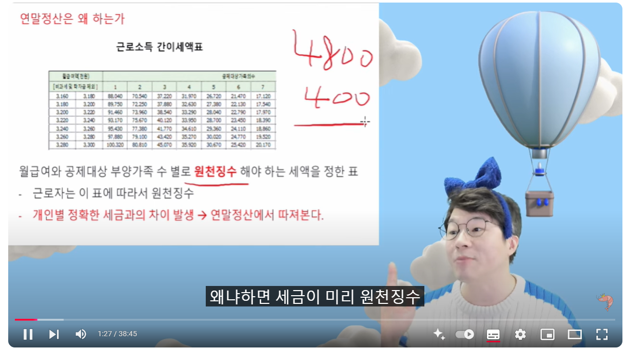 (01:05) 우선 혹시라도 연말정산을 왜 하는지 모르시는 분이 계실 수 있어요 다 아실 걸로 생각하지만 혹시라도 모르시는 분이 계실까봐 간단하게 설명해 드리겠습니다 자 여러분들이 근로자고 월급을 받을 때는 당연히 세금이 원천징수됩니다 예를 들면 연봉이 4,800이라 그래서 12개월 한 달에 400 받죠 400 그대로 안 받죠 왜냐하면 세금이 미리 원천징수 미리 빠지기 때문에 그렇습니다 자 그러면 내 세금이 얼마인지 알고 네가 떼냐 사람마다 세금이 다를 수 있잖아요 하지만 국세청이 지금 벌써 일일이 개별적으로 할 수 없기 때문에 근로소득 간이 세액표 그러니까 모두에게 적용되는 간단한 세액표를 통해서 일괄적으로 원천징수를 합니다 하지만 일괄적으로 하다 보니까 당연히 개인의 정확한 세금과는 차이가 발생하겠죠 그래서 그 차이를 연말정산에서 따져보는 게 됩니다 자 그러면 아니 세금 원천징수 하지 말고 다 결정된 다음에 걷어요 뭐 하려고 미리 걷어서 나중에 두 번 합니까 그냥 아예 확정된 다음에 걷어라 좋은 말씀인데요 잘 내겠냐의 문제가 있죠