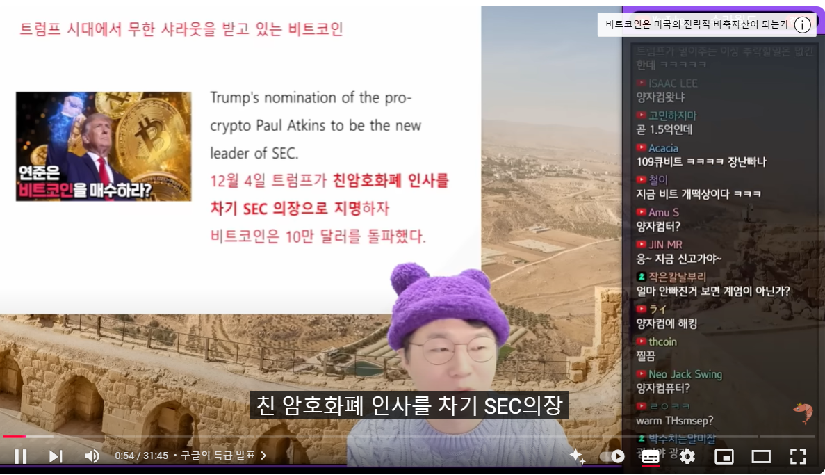 (00:07) 마지막 주제는 잘 모르는 주제예요 여러분들이 여기서 듣고 전문가 분들의 유튜브나 아니면 책을 참고하시길 부탁드립니다 제가 잘 모르는 분야인데 왜 갖고 왔냐 경제적인 것도 있거든요 잘나가던 비트코인에 찬물을 끼얹는 뉴스가 지난주에 있었습니다 비트코인 좋은데요? 좋긴 좋아요 찬물이라는 것도 아주 살짝 얼마나 살짝이냐? 12월 5일날 10만 3천 650달러 미쳤죠? 10만 3천 달러를 찍었다가 순간적으로 빠지면서 한 7%? 9만 7천 달러까지 밀렸습니다 물론 비트코인이죠 지금 가장 잘나가는 비트코인이기 때문에 쭉 밀렸다가 쭉 회복을 해서 지금 9만 9천 달러 10만 달러 근처에 가 있죠 지금은 그런 상황인데 지난번에 슈카월드가 나왔지만 비트코인은 트럼프 시대의 무한 샤라웃을 받고 있습니다 친 암호화폐 인사를 차기 SEC의장 증권거래위원장에 지명하기도 하고 해서 비트코인이 엄청나게 올라갔죠 게다가 최근에는 트럼프가 크립토 차르까지 지명을 했어요 데이비드 하하스 크립토차르는 뭐냐 진짜 이야 차르라는 얘기가 지금 실화냐
