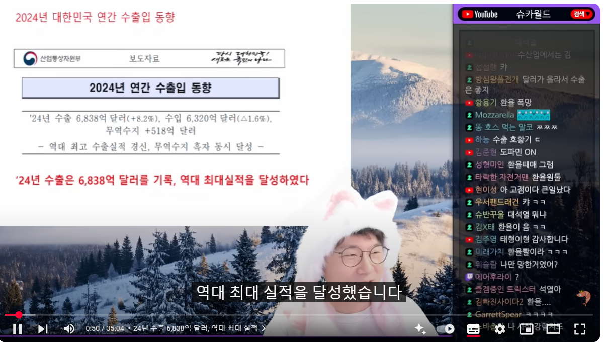 (00:08) 두 번째 주제는 대한민국 수출 얘기를 안 할 수가 없어요 그래도 경제 채널이죠 연초니까 오늘은 수출 특집, 경제 방향 특집 대한민국 경제에 대해서 두 개의 주제가 준비되어 있습니다 대한민국의 수출을 이끄는 의외의 업종 2025년을 밝게 이끌어 줄 의외의 업종 몇 개 보여드리도록 하겠습니다 이걸 보여드린 이유는 얼마 전에 2024년 대한민국 연간 수출입 동향이 발표됐습니다 확정됐어요 2024년 대한민국 수출은 어떻게 됐냐? 2024년 대한민국 수출은 6,838억 달러를 기록해서 역대 최대 실적을 달성했습니다 ㅎㅎㅎㅎ 누가 그래 우리 망한다고? 어디만 가면 망한대 망하긴 뭘 망해 역대 최대 실적이야 형 아직 안 죽었어 아빠 안 잔다 아빠 자긴 뭘 자 안 자요 안 자 역대 최대 실적을 달성했습니다 답답하네 진짜 어디 가서 자랑할 수도 없고 현재 보면 사상 최대 실적인데 얼마나 최대 실적이냐? 2억 달러 더 했어요 다행이다x2 2022년에 6,836억 달러인데 6,838억 달러 기가 막히네 마지막 2억 달러 수출하신 분 복 받으실 거예요 복 받으실 거야