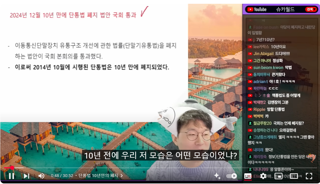 (00:08) 자, 봅시다 두 번째 주제는 드디어 폐지됐습니다 뭐가? 단통법이죠? ㅎㅎㅎ 드디어 폐지됐다 드디어 단통법이 폐지됐는데 이거 몇 년 만에 폐지된 건지 아십니까? 단통법이 10년만에 폐지됐어요 2014년에 등장한 단통법이 2024년 12월부로 폐지가 됐습니다 2024년 12월 10일 10년 만 단통법 폐지 법안이 국회를 통과했습니다 이동통신단말장치 유통구조 개선에 대한 법률 짧게 줄여서 단말기 유통법 우리가 흔히 부르는 건 단통법이죠 폐지하는 법안이 국회 본회의를 통과했고요 방금 말씀드렸듯이 10년 만에 와, 10년 만에 10년 만에 폐지가 되었다 10년 전에 우리 저 모습은 어떤 모습이었냐? 핸드폰 살 때 이런 모습이었습니다 요즘에 안 보이죠? 이런 거 기억나십니까? 와 뭐 할인 뭐 하면 우르르르 가고 막 뭐 붙이고 뭐 붙이고 여긴 뭐예요x2 그 다음에 그 아저씨들이 핸드폰 살 때 말로 하면 녹음한다고 계산기 막 찍어 보여주잖아 막 촥촥촥촥 오케이? 아 이거 아니야? 그럼 말로 하면 녹음한다고 또 막 한 다음에 이렇게 보여주고
