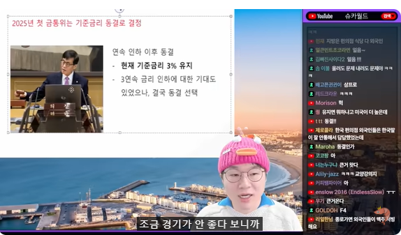 (00:08) 세 번째 주제는 약간 씁쓸한 주제인데 이렇게 안 좋다는 얘기를 하고 싶진 않은데 또 안 할 수도 없는 그런 게 있습니다 얼마 전에 우리나라 기준금리가 동결이 됐습니다 2025년 첫 금통위가 열렸는데요 한국 기준금리 얼마가 됐냐? 3%로 동결했습니다 지난 두 번의 금통위에서 25bp, 25bp 연속 인하를 했어요 그래서 0.5%, 50bp가 내려갔잖아요 인하가 돼서 3%까지 왔는데 조금 경기가 안 좋다 보니까 세 번 연속 인하할 수 있지 않냐라고 생각했지만 안 되고 결국에 동결을 선택했습니다 동결이 됐는데 기자회견 때 한국은행 총재님이 이렇게 얘기하셨어요 이 정도 센 발언은 오랜만에 봤는데 경기 상황만 보면 지금 금리를 내리는 게 당연한 상황이었다 제가 채권 바닥에 그래도 15년 이상 봤는데 금통위하고 한국은행 총재분들이 발언하시는 걸 많이 봤는데 인하를 한 다음에 이런 말을 하는 경우는 많이 있는데 동결을 한 다음에 막상 동결은 했지만 경기 상황만 보면 금리를 내리는 게 당연한 거였다 하지만 못 내렸다
