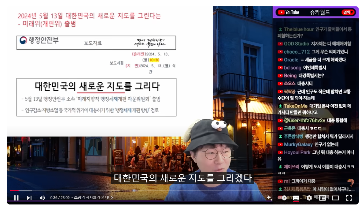 (00:08) 이거 재미있는 주제입니다 이번 주제는 왜냐하면 우리 얘기거든요 초광역 지자체가 오고 있습니다 초광역 울트라 슈퍼 캡숑 짱 지자체가 오고 있다 이게 오늘의 주제인데요 초광역 지자체가 뭐냐 여러 개의 지방자치단체 있죠 이걸 합치는 겁니다 그게 초광역 지자체인데 갑자기 초광역 지자체 얘기를 왜 하냐 2024년 5월 13일 대한민국의 새로운 지도를 그리겠다는 원대한 꿈을 꿈꾸고 소위 개편위가 출범을 합니다 대한민국의 새로운 지도를 그리겠다 그리고 10월에 이슈가 개편안이 슬슬 등장을 하는데 미래의 검토안에는 광역시・도의 통합 자치단체 구역 변경 자치단체 기능 조정 지방행정체제 전반에 관한 조금 이따가 보여드리겠지만 폭탄 같은 소리입니다 광역시・도를 통합하는...