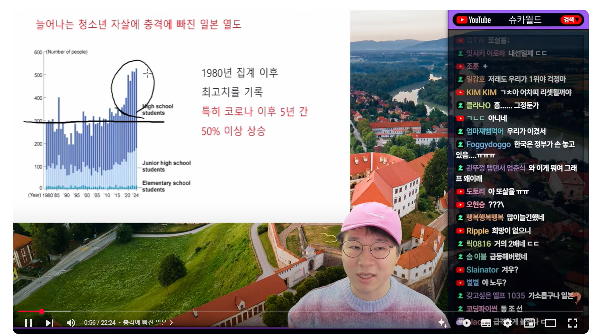 (00:02) [음악] 자이 주제는 약간 하긴 싫었는데 어쩔 수 없어서 가져왔습니다 약간 안 좋은 내용이 있어요 이해하고 봐주기 감사하겠습니다 자 충격에 빠진 일본과 느긋한 한국이라 주제를 가져왔습니다 일본은 뭐에 충격을 빠졌고 한국은 뭐에 느긋한 일본 신문에서 며칠 전부터 계속 헤드라인을 장식하면서 나오는 주제가 있는데 그게 뭐냐 바로 이겁니다 일본청소년 가 역대 최고를 기록했다 안 좋은 뉴스죠 웬만하면 하긴 싫었는데 일본 초중고 학생들의 527명이 2014년에 이제 스스로 목음 끊었는데이 숫자가 역대 최고다라고 일본 언론에서 계속 나오고 있습니다 왜냐하면 생각보다 많이 들었거든 한 300명 정도 수준을 유지하다가 2020년 코로나를 기점으로 거의 50% 올랐어요 300 대에서 500 대니까 50% 이상 최근 5년간에 쭉쭉쭉쭉 올랐는데 이제 2014년이면 코로나 충격도 끝날 때니까 줄어들지 알았는데 안 줄어든다는 거예요 그리고 아직도 더