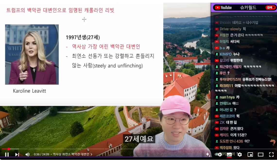 (00:07) 자, 오늘의 메인 주제 중에 하나인데 그 주제는 뭐냐 아 좋아요 언론 믿지 마 유튜버를 믿어 아 죄송해요 오랜만에 마음에 드는 주제가 나왔네요 언론 믿을 게 뭐 있겠습니까 유튜버를 믿으면 됩니다 유튜바를 믿으세요 유튜바를 자 제가 이 얘기를 하는 이유는 간단합니다 뭔 헛소리를 하냐 제가 한 얘기가 아니고요 아주 중요한 사람 얘기했습니다 누가 얘기했냐 백악관에서 나온 얘기입니다 트럼프는 백악관 대변인으로 캐롤라인 리빗이라는 분을 임명했습니다 1997년생 27세예요 역사상 가장 어린 백악관 대변인입니다 이분을 평가하는 말들을 찾아봤는데 최연소 선동가 또는 강렬하고 흔들리지 않는 사람 이렇게 평가해 되게 심 지가 굳건하고 누가 뭐라 그러건 자기 스타일대로 밀어붙이는 파워풀한 그런 사람인 것 같아요 캐롤라인인데 캐롤라인 얘기를 조금만 드리면 자기보다 32살 많은 59세 부동산 개발자와 결혼했습니다 이걸로 화제였어요 남편이에요 그리고 지금 아이도 있습니다 트럼프의 신뢰가 굉장히 높은데 특히 일화가 하나 있어요 그래서 갖고 온 건데 이 아이를 낳을 때 트럼프 피격 사건이 발생했어요