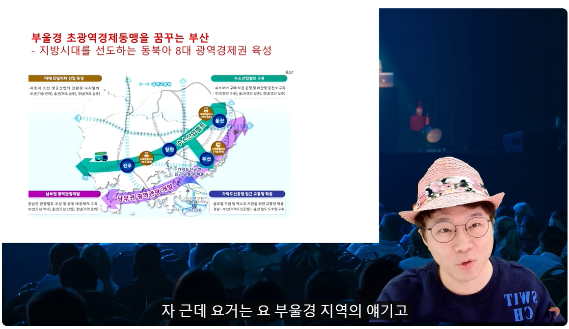 (00:08) 자, 여러분 안녕하세요 오늘의 주제는 글로벌 허브도시의 꿈 한번 다시 한번 가져와봤습니다 아마 슈카월드를 보셨던 분이라면은 요거 아마 보셨을 거예요 부산이 부울경 초광역경제 동맹을 꿈꾸고 있다 아 수도권 1극이 아니라 이제 부산도 양극 또는 다극화를 위해서 이 동북아 8대 광역 경제권 육성하겠다 초광역 경제동맹 자, 지난번에 아마 보여드렸을 겁니다 자 근데 요거는 요 부울경 지역의 얘기고 부산시가 꿈꾸는 건 하나 따로 있습니다 그건 뭐냐? 바로 오늘의 주제인 글로벌 허브도시 꿈이 있습니다 캬 멋있다 글로벌 허브도시가 뭐냐? 싱가포르에 비견되는 글로벌 허브도시로 부산을 만들겠다 대한민국의 신성장동력 남부권 혁신의 거점 비즈니스 자본 사람이 몰리는 허브도시 허브가 말 그대로 몰리는 거잖아요 사람이 왔다가 나가고 왔다가 나가고 하는 중앙에서 허브 역할을 하는 글로벌 허브도시가 되겠다는 게 부산광역시의 목표라고 할 수 있습니다 이거를 조금 이해하기 쉽게 써보면 바로 이런 거죠 글로벌 허브도시란 물류의 허브이기도 하고