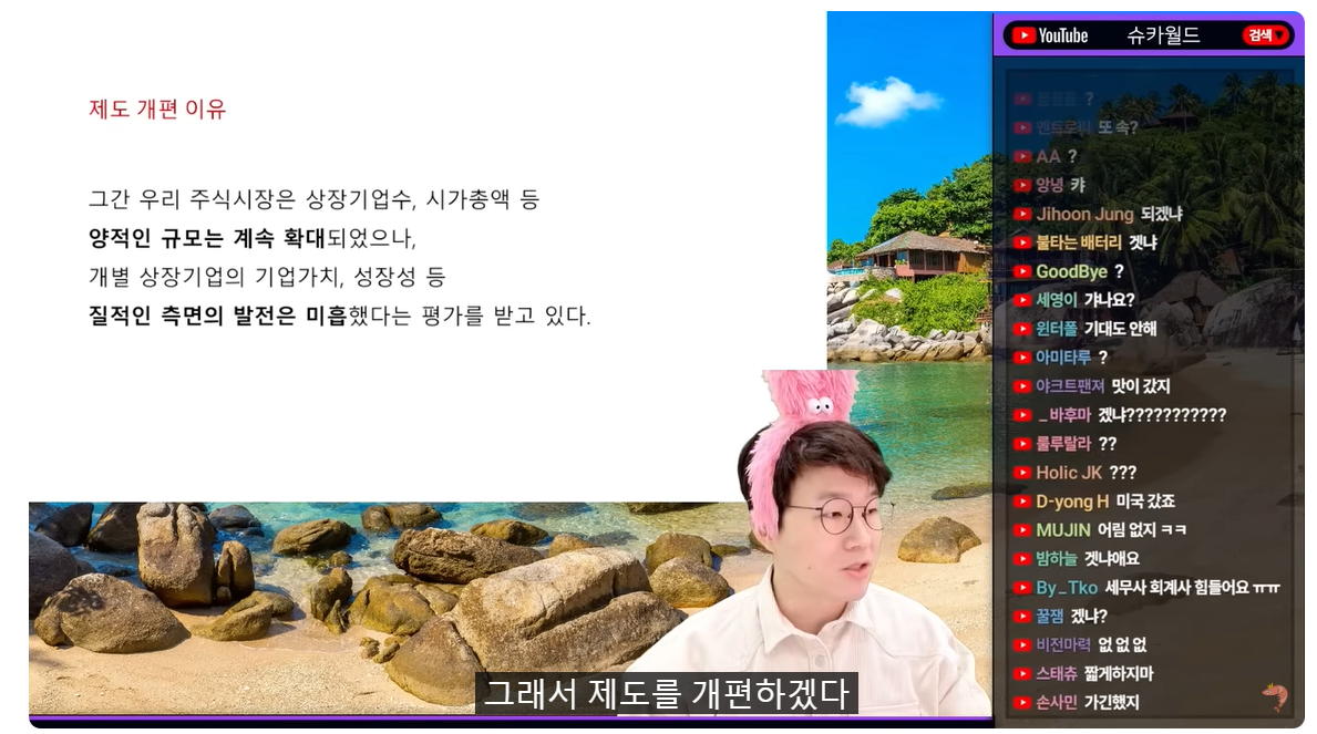 (02:02) 7% 오메 6개 중에 1개는 처음 본 기업이야 누가 저한테 그러더라고요 야, 무슨 경제방송한다는 놈이 기업 이름도 몰라 그걸 어떻게 알아? 그걸 어떻게 알아? 거래소 이사장님도 모를 거야 그걸 누가 알아? 아니... 이거 어떻게 알아? 이거 진짜 외우는 사람도 아니고 어떻게 알아? 1년에 100개씩 등장하는데 이거 뭐 2-1 이런 식으로 했었던 거야? 이러면 어떻게 알아? 몰라 몰라 7개 중에 6개 중에 하나는 새로운 기업이기 때문에 몰라요 이건 모르고 미국의 5배 일본과 대만의 2배가 새로 상장합니다 비중으로 따졌을 때 그래서 양적 으로는 화끈한 성장을 하고 있다고 표현을 하고요 물론 질적으로는 옛날에 한번 보여드렸죠? 시가총액 상승률 35% 그것도 꼴찌인데 주가지수는 4% 올랐습니다 저런 요인이 있는 거예요 왜 4% 올랐냐 새로 상장한 애들이 쫙쫙쫙쫙 가야 되는데 뭐 이렇게 되니까 어