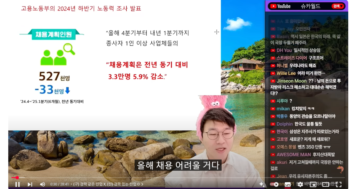 (00:08) 자, 그 다음 주제 빨리빨리 하겠습니다 새로운 취업 트렌드 여러분들한테 보여드리겠습니다 자 새로운 취업 트렌드 뭐냐 중고 신입입니다 중고 신입 새로운 취업 트렌드 중고 신입 중고 신입 일단 중고 신입 뭔지는 뒤에서 보여드리도록 하겠습니다 자 고용노동부가 얼마전에 2024년 하반기 노동력 조사를 발표했어요 뭐라고 발표했냐? 이렇게 얘기했습니다 올해 채용 어려울 거다 2024년 4분기부터 2025년 1분기까지 사업체들의 채용 계획이 5.9% 감소했다 3만 3천 명 줄었다 전년에 비해서 6% 정도 채용을 안 한다고 합니다 3만 명 정도 채용을 안 하는데 대기업이 안 합니까? 중소기업이 안 합니까? 그거 둘 다 안 합니다 300인 미만 6.