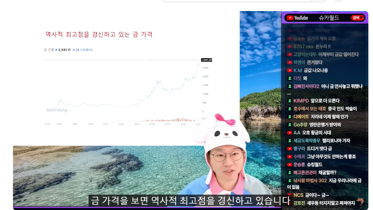 (00:08) 자, 오늘의 마지막 주제 여기저기서 많이 얘기하는 금 가격 얘기 슈카월드에서 한번 해보도록 합시다 금 가격이 폭주하고 있다 요즘 뭐 경제 유튜버분들이라면 안 하는 분이 없는 그런 주제죠 신문, 뉴스에도 확 뒤덮고 있는데 금 가격이 폭주하고 있다 언론에서 보셨겠지만 조폐공사가 골드바 판매를 중단했다 골드바 판매는 안 해 왜 안 하냐? 비싸서가 아니라 금 원자재 수급 문제로 현물 금이 없다 골드바 상품에 대한 판매를 일시적으로 중단한다 우리 금 없어 금 없기 때문에 온라인에서는 가능합니다 현물로는 이제 판매를 못하겠다 한시적으로 라고 얘기를 하고 있죠 금 가격을 보면 역사적 최고점을 경신하고 있습니다 좀만 가면 3,000달러 위로 갈 것도 같아요 2,941까지 기록했죠 제가 작년에 2024년 4월에 금 역대 최고가 이런 영상 올렸습니다 슈카월드 채널에서 그때 뭐라고 썼냐 위에 보시면 돌반지 한돈에 45만 원 와 미쳤다 라고 썼죠 지금 60만 원입니다, 60만 원 공식값이 60이야 여러분들이 사러 가면은 소매점에 가면 70일 수도 있어요 한돈이 60이야