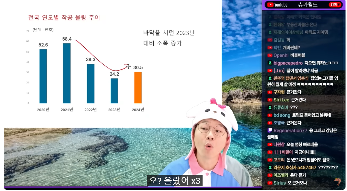 (00:08) 자, 그 다음 우리나라 얘기 잠깐 하죠 이것도 또 좋은 얘기는 아니네요 미분양 주택이 10년 내 최대치를 찍었다는 뉴스가 있습니다 대한민국 미분양 주택이 10년 내 최대값을 찍었다 어디서 나온 거냐면요 2024년 주택 통계가 발표됐습니다 통계를 보여드릴 텐데 일단 2024년 주택 건설 실적은 전년보다 전반적으로 개선되었습니다 개선되었어요, 개선되었어 악화되지 않았어 그게 무슨 소리냐? 연도별 착공 물량을 보면 쭈욱 내려가다가 오? 올랐어 x3 30만 원 올랐습니다 쭉? 아유 큰일났죠 10-15만원 이렇게 떨어졌으면 큰일 날 뻔 했는데 바닥을 치다가 착공 물량이 소폭 증가를 했구요 인허가 물량도 어? 하다가 보합에는 성공했습니다 43만원 정도니까 2023년 대비 보합해버렸기 때문에 다행히 전반적으로 개선된 거 아니냐 다만 조금만 뜯어보면 개선은 됐긴 됐는데 문제는 작년에 대비해서 올해 인허가 실적을 보면 공공 부문이 많이 올랐어요 건설 경기가 안 좋으니까