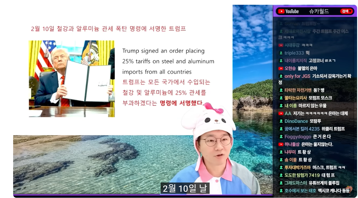 (00:08) 자, 그리고 이번 주제는 또 미국이 많네요 그럴 수밖에 없는 게 미국이 하드캐리를 하고 있기 때문에 전 세계를 휘젓고 다니면서 미국으로만 주제 5개를 다 채울 수도 있는 그런 상황이라고 할 수 있습니다 금주의 트럼프 또 등장을 했습니다 금주의 트럼프 안 가져올 수가 없어요 한 주마다 금주의 트럼프 주제는 뭐냐 동맹의 분열입니다 동맹의 분열 기미가 보이고 있다 무슨 동맹이냐? 그 얘기를 해보도록 하겠습니다 2월 10일 날 여러분들 다 보셨다시피 트럼프가 철강과 알루미늄에 대해서 관세 폭탄 명령에 서명을 했습니다 모든 국가에서 수입되는 철강 및 알루미늄에 25% 관세를 매기겠다 쫙 서명했죠 우리나라뿐만 아니라 다른 모든 나라들이 25% 관세를 매기게 됩니다 이게 언제부터 발효되냐? 3월 12일부터입니다 한 달 뒤에 당장 발효가 되고요 미국을 다시 부유하게 만드는 시작이다 라고 트럼프가 얘기를 했죠 그런데 관세 소식을 듣자마자 호주 총리가 전화를 걸었대 트럼프한테 딱 전화해서 각하x2 전대요x2 왜? 그러니까 저희는 그 25% 관세 빼주세요