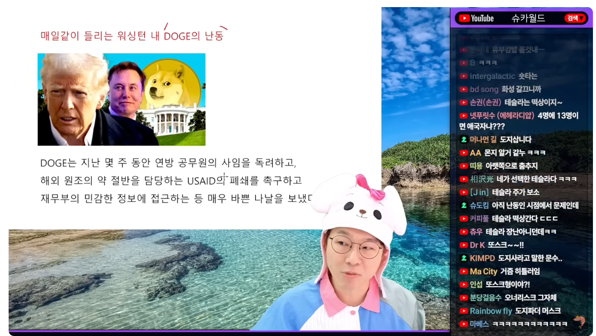 (00:02) [음악] 자 두 번째 주제는 제가 보기 황당한 얘기입니다 폭주하는 머스크와 이제 춤추는 테슬라 춤추다보면 테슬라 주주 테슬라 주주들의 속이 타 들어가고 있어요 적당히 하자 적당히 하자 머스크 형 때문에 테슬라 주가가 오르는 건 알겠는데 머스크 때문에 테슬라 주가가 내려가기도 하죠 적당히 하자 적당히 요즘엔 좀 폭주하는 게 아닌가라는 생각이 들고 있습니다 자고 얘기를 한번 드리도록 하겠습니다 자 최근에 미국에서는 거의 도지의 아니라 그러죠 우리로 치면 도지의 아니야 난리가 않죠 도지가 거의 난동을 피우고 있습니다 지난번 슈카월드 영상에 나왔듯이 해외 원조의 절반을 담당하는 USA 폐쇄하고 연방 공무원 막 사임 시키고요 재무부의 정보에 접근해서 뭘 하려 그러고요 하여튼 뭔가 삭감 내지 유아 파이 얼드를 하는 걸 마구마구 시전을 하고 있죠 난동을 피고 있는데 본인은 이렇게 얘기합니다 나는 미국이라는 아메리카 주식 회사에 들어와서 일종의 기업 재건을 하고 있는거다 구조 조정을 하고 있는