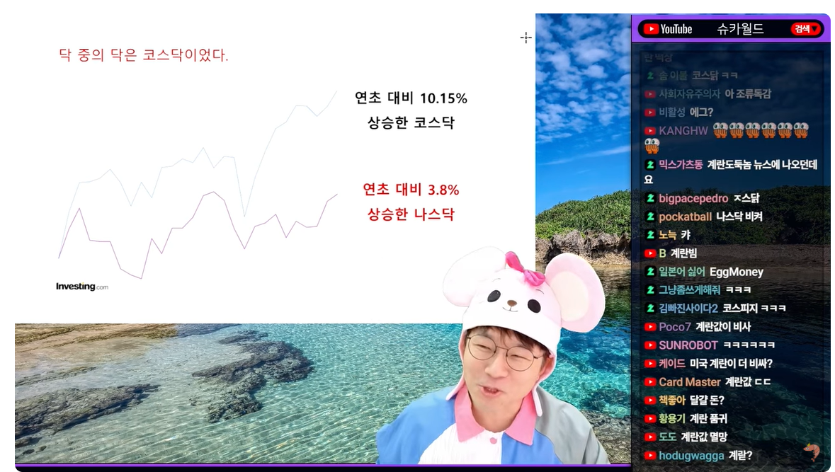 (00:02) [음악] 에그머니나 아는 주 갖고 왔습니다 자 왜냐하면은 지금 미국이 에그머니 빠져 있습니다 아 사실 미국 뉴스로만 보면은 난리난 거 같은데 한국인들 입장에서는 뭐 그거 그렇게 심한가 생각하지만 미국인들은 조금 심각하게 생각하는 그 얘기 한번 해보도록 하겠습니다 역시 에그에 관한 얘기가 되겠죠 자 현재 세계에서 가장 뜨거운 주 시장이 어디냐 중 의 닭이 어디냐 나스닥 아닙니다 나스닥 투자한 분들은 연초 대비 4% 못 먹었어요 코스닥에 들어가신 분이 연초 대비 10%지었습니다 누가 코스닥 무시했나 올해 코스닥 들어간 사람이 승자예상 10% 올랐어 나스닥 4% 야 그거 어다 붙여 저거 야 예금이나 들 걸 나스닥 아 3.