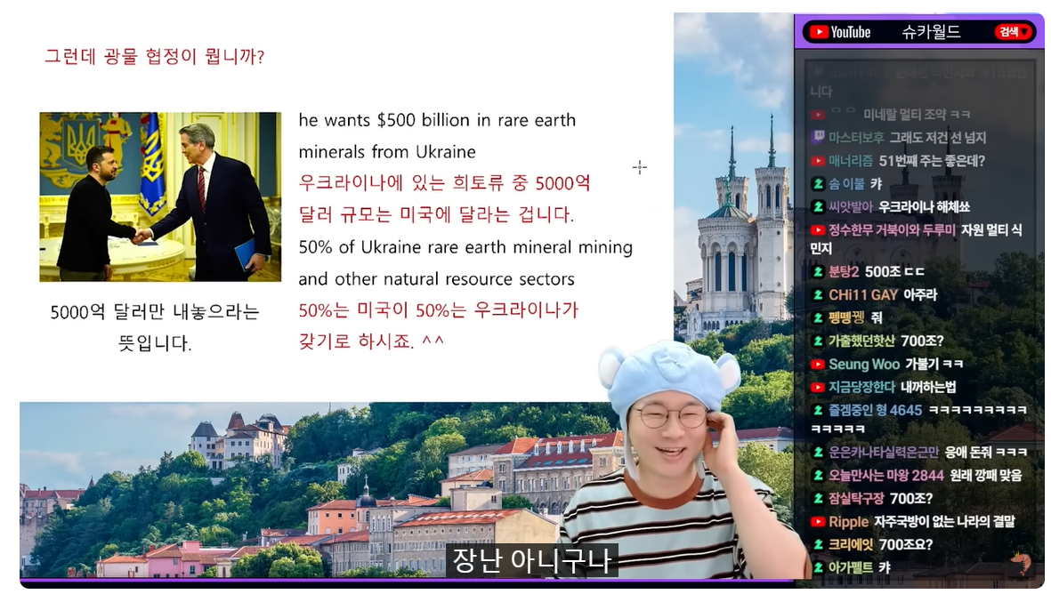 (01:12) 광물 거래, 광물 협정이 뭔데요? 이렇게 얘기했습니다 우크라이나에 있는 광물 중 특히 희토류가 좀 있대 광물 중에 5천억 달러 규모는 미국에 주면 됩니다 5천억 달러면 얼마예요? 700조x2 어머어머 70조도 아니고 맞잖아 오우, 700조 장난 아니구나 어, 700조 정도를 미국에 달라 아 우리가 그리고 양심 있으니까 다 달라고는 안 해 50%는 미국이 갖고 니들 나라 광물 있으면 50%는 우크라이나 갖자 반반, 퉁! 오케이? 그 반만 주면 너희 나라 안보 우리가 지켜줄게 왜냐? 반은 내꺼니까 너 좋잖아x2 생각해봐 아무도 우크라이나 못 쳐들어온다? 감히 미국 거에다가 침 바르는 사람이 있겠니? 네가 안전하려면 주면 돼 나한테 그럼 너 안전하잖아 라고 가서 얘기를 했죠 근데 무슨 5%도 아니고 50%는 날강도 아니야 날강도 우크라이나의 희토류 광물에 대한 50%의 소유권을 미국에 부여하는 내용의 협정 초안을 제시했다 사인해라