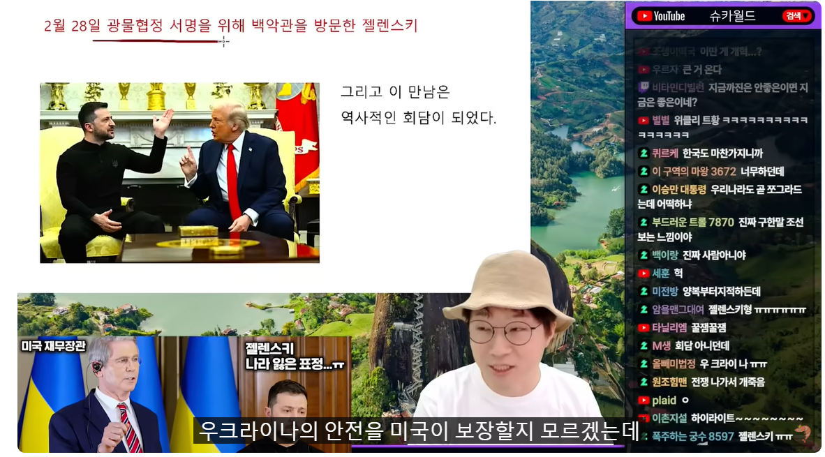 (00:08) 오늘의 메인 주제 들어갑시다 눈물의 우크라이나 눈물 없이는 볼 수 없다 저는 이걸 보면서 차마 그 영상을 볼 수가 없었어요 와... 이 영상 보셨죠? 대부분 트럼프하고 회담하는 영상 감정이입이 돼서 볼 수가 잘 없었는데 그 내용이 어떤 내용인지 한번 보도록 합시다 2월 28일 날 광물 협정 서명 뭔지 아시죠? 우크라이나의 안전을 미국이 보장할지 모르겠는데 하여튼 미국이 도와준다는 걸로 우크라이나는 광물 중에 일정 비중 지금 50% 얘기하죠 50% 가까이를 내놔라 라는 광물 협정에 서명을 하기 위해서 젤렌스키가 미국의 백악관을 방문했습니다 그리고 회담을 하는데 이 만남은 진짜 역사적인 회담이 됐습니다 그 얘기를 해봅시다 일단 백악관에 도착한 젤렌스키를 트럼프가 마중을 나왔어요 마중을 나올 때부터 심상치 않았어 왜냐하면 평상시처럼 이렇게 입고 다니잖아요 검은색 셔츠 차림에 젤렌스키가 딱 왔는데 트럼프가 보자마자 내뱉은 첫 마디가 이거였어요 우와 오늘 옷 잘 입고 왔네? 이렇게 얘기했어요 You are all dressed up today