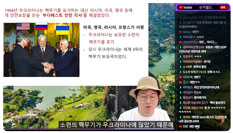 (00:08) 자, 그리고 하나 더 주제가 하나 더 있습니다 떨고 있는 한 나라가 더 있거든요 트럼프와 젤렌스키 모습을 보고 우리도 약간 뜨끔했단 말이에요 설마 우리한테도 그러진 않겠지? 설마 야 그래도 한미동맹은 튼튼한데 떨고 있는 한 나라가 또 있어요 어딜까? 여기는 진짜 떨고 있습니다 우리보다 더 떨고 있어, 왜냐? 방금 말씀드렸지만 젤렌스키가 백악관에 가서 사실상 조롱과 호통을 당했습니다 뭐 양복은 있냐? 이런 소리를 들었죠 근데 우크라이나는 1994년 여러분도 다 아시겠지만 핵무기를 포기하는 대신에 러시아, 미국, 영국 등의 안전보장을 받는 부다페스트 안전 각서라는 걸 체결했어요 다 사인했죠 이게 클린턴입니다 클린턴, 옐친, 당시에 소련이었지만 옐친, 그리고 이게 우크라이나 대통령이에요 우크라이나는 그동안 소련의 핵무기가 많았어요 다 아시는 내용이지만 소련의 핵무기가 우크라이나에 많았기 때문에 핵무기를 가질 수 있었는데 내가 포기하는 대신에 내 안전을 지켜달라 그래서 미국, 영국, 러시아, 프랑스가 서명했어요 어머, 지켜줄게 당시 소련 그리고 우크라이나는 갖고 있던