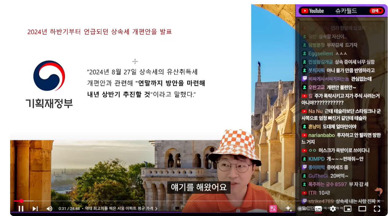 (00:08) 자, 세 번째 주제는 우리나라로 돌아오죠 상속세 얘기 한번 해봅시다 여러분들이 관심이 많은 주제 상속세입니다 상속세 정부 개편안이 발표됐습니다 어떤 내용으로 어떤 내용이 나왔는지 보신 분 계십니까? 상속세가 바뀐다 지난번에 슈카월드에서도 작년에 한번 나왔었는데 왜냐하면 2024년 하반기부터 정부는 꾸준히 상속세 개편안을 발표하겠다고 얘기를 해왔어요 2024년 8월 27일 상속세에 대한 전반적인 개편 방안을 연말까지 말해서 내년 상반기에 추진하겠다 그게 바로 이번에 발표한 개편안이라고 할 수 있습니다 그리고 상속세 개편안에 정말 많은 사람들이 관심을 보이고 있죠 정부도 되게 급한 것 같아 관심 갖는 사람들이 많고 왜 그러느냐? 제 생각엔 ㅎㅎㅎㅎㅎ 죄송한데 이게 아주 큰 영향을 미치지 않을까라는 개인적인 약간 불충한 생각을 합니다 2025년 1월 기준 서울 아파트 평균 가격이 역대 최고치를 찍고 있거든요 참 묘한 타이밍에 그쵸 좀 관심이 높아지고 있어요 얼마를 찍었냐