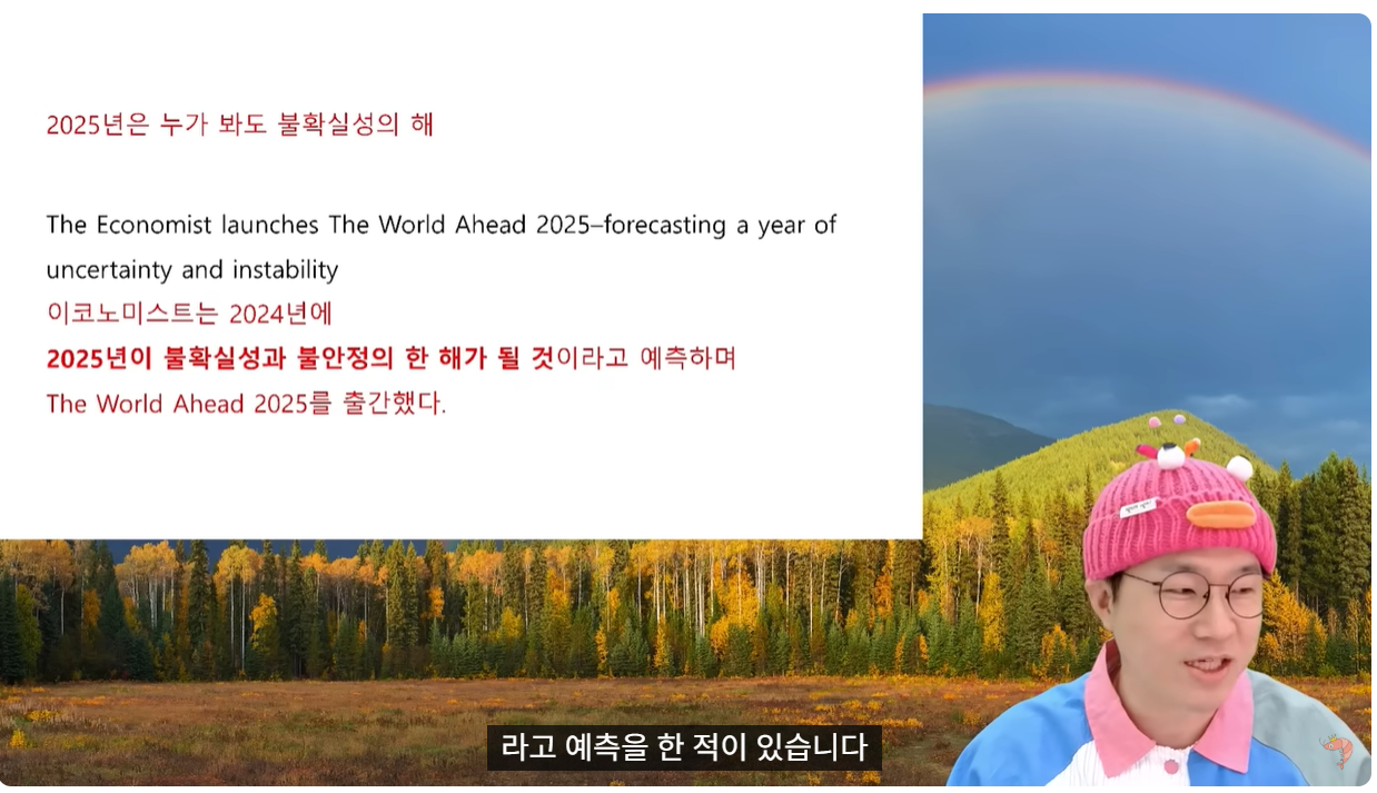(00:08) 자 ,여러분 안녕하세요 오늘은 2024년 작년에 지구 기온이 1.5도씨가 붕괴했다 아하 라는 이야기를 한번 해보도록 하겠습니다 자 여기 오피셜이 나왔어요 세계기상기구 WMO가 작년 지구 기온을 1.5도씨가 넘었다라 공식적으로 얘기를 했는데 자 그 얘기를 한번 나눠보도록 하겠습니다 자 2025년은 누가 봐도 불확실성의 해입니다 일단 트럼프 대통령이 당선된 다음에 이 세계가 어디로 갈지 좀 헷갈리죠? 이코노미스트지도 2024년에 이미 2025년은 불확실성과 불안정의 한 해가 될 것이다 라고 예측을 한 적이 있습니다 사실은 제가 굳이 말할 필요도 없는데 정치부터 보면 지난 유엔 총회에서 러시아의 책임을 묻고 즉시 우크라이나 전쟁을 멈추라라는 결의한 투표가 있었어요 그런데 놀랍게도 미국이 반대표를 행세했죠 러시아에 책임을 물을 수 없다 아니면 즉시 우크라이나 전쟁을 멈출 수 없다 여기에 투표한 건데 미국과 함께 반대표를 행사한 국가들이 미국, 러시아, 북한, 이스라엘이었습니다 찬성표를 택한 국가들은 거의 대부분의 EU 국가 프랑스, 독일, 오스트리아 이런 국가였고요