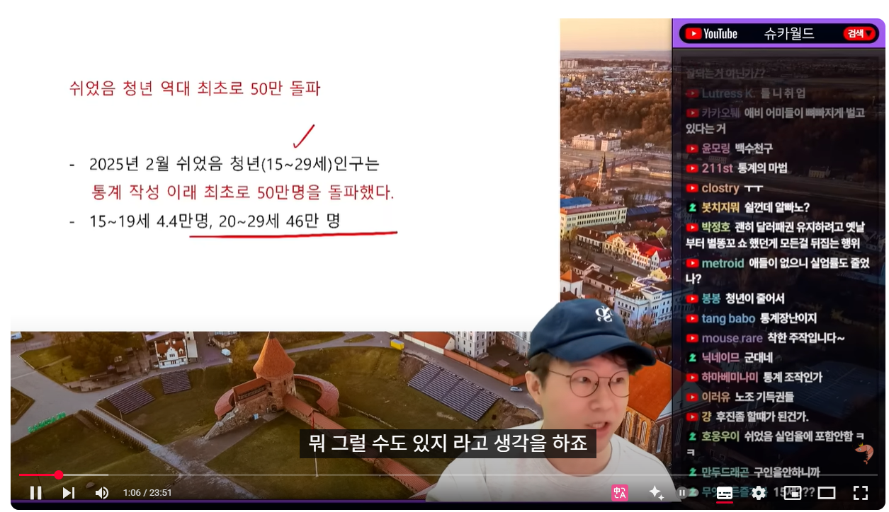(01:01) 4만 20세에서 29세가 46만인데 20대가 46만 명이 그냥 쉰 겁니다 뭐 그럴 수도 있지 라고 생각을 하죠 그러면 큰일 났다 이렇게 많이 쉬니까 실업률 엄청 올라갔겠네 아닙니다 실업률 최근에 엄청 낮아요 무려 2.8%입니다 우리가 흔히 경제학적으로 완전고용이 3% 얘기해요 왜냐하면 실업률 3%는 자연스럽게 생겨 이직할 때도 생기고 몸 안 좋아서 쉴 수도 있고 일하기 싫고 이런 사람도 있기 때문에 3% 정도는 그냥 완전고용이야 우리 2.8이야 일하고 싶은 자는 모두가 일할 수 있는 완전고용의 나라 그 자체라고 할 수 있죠 실업률은 쭉 내려갔어요 한때 4% 코로나 쭉 내려갔습니다 아 그럼 이건 전체고 청년 실업률이 오른 모양이구만 이 청년 말고 중장년층의 실업률이 내려가고 아 청년 실업률이요? 안정 그 자체요 이거 보세요 6% 아래로 내려왔어 옛날에 8%, 5% 그랬어요 9.