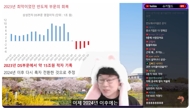 (01:00) 이렇게 벌던 때가 있었다 여기 50조 하던 시대가 있었는데 반도체는 사이클이니까 사이클이 올라갔다 내려가면서 작년에 심히 안 좋았는데 올해 힘차게 회복하고 있는 모습을 보인다는 거죠 당연히 삼성전자가 이렇게 실적이 좋은 건 방금 말씀드렸지만 반도체 부분이 회복했다 반도체 부분에서 작년에 적자가 엄청났는데 이제 2024년 이후에는 흑자로 바뀐 게 아니냐 특히 작년에 벌써 기억이 안 나겠지만 삼성전자가 정말 오랜만에 25년 만에 했던 게 있었으니 눈물의 감산이었습니다 너무 가격이 떨어지니까 이대로 생산하면 안 된다 삼성전자가 D램, 낸드플래시 감산을 선호했어요 감산을 하면서 그거 때문인지는 몰라도 반도체는 사이클이니까 가격이 어느 정도 회복되면서 지금 D램과 낸드플래시보다 가격도 올라가고 수요도 좋은 그런 상황이 다시 오고 있습니다 삼성전자 뿐만 아니죠 SK하이닉스는 역시 작년에 엄청난 손실을 보다가 2023년 4분기부터 흑자 전환에 성공을 했죠 특히 지난번에 나왔지만 SK 하이닉스는 이미 HBM 공장 같은 거 만들면서 외신에서 이런 표현이 나왔어요