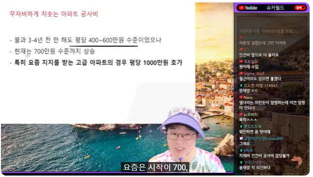 (00:06) 이번 주제는 얘기는 좀 짧아요 그냥 우리나라, 우리나라 얘기 잠깐 드리도록 하겠습니다 여러분들 많이 다 아시는 얘기예요 바로 파죽지세인 아파트 건설비 아, 큰일이다 큰일이다 결론은 큰일이라는 겁니다 결론은, 아, 너무 많이 올랐어 건설 공사비가 작년에 파죽지세로 오르다가 2022년에 재작년이구나 재작년 파죽지세로 올리다가 조금 완만하지만 그래도 아직도 꽤 오르고 있습니다 요기죠, 요기 최근 20년 내 가장 가파르게 상승인데 건설 공사비 이슈라는 건 평균값이에요 근데 평균값만 해도 3년 전보다 27%, 30%가 올랐습니다 근데 아파트 공사비로 치면 이건 말 그대로 초저가까지 다 합친 거기 때문에 이거보다 더 많이 올랐다고 봐야 되고 얼마나 올랐냐 요즘 뉴스를 보시면 알겠지만 3, 4년 전만 해도 보통 아파트 재건축이나 공사비 계약할 때 평당 400만원, 600만원 요즘은 시작이 700, 옛날에 시작이 400이었는데 얼마 오른 겁니까 거의 뭐 50% 이상, 60% 이상 상승을 하고 또 요즘에는 재건축은 대부분 고급 아파트로 있잖아요
