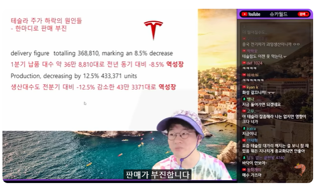 (01:09) 물론 여러 가지가 있는데 한마디로 얘기하면 판매가 부진합니다 간단하게 얘기하면 기업은 실적이죠 실적이 부진해요 1분기 납품 대수도 역성장을 했고요 -8.5% 생산 대수 그것도 역성장을 했어요 분기 대비 -12% 한마디로 물건도 적게 만들고 적게 팔리니까 주가가 하락하는 건 당연한데 그럼 왜 이렇게 실적이 안 좋았냐? 물론 1번은 글로벌 전기차 수요가 안 좋죠 다 아시는 거 옛날에 케즘존 얘기했던 그런 것들 그런 것들도 있는데 더 큰 문제가 있죠 중국산 전기차들이 본격적으로 수입되고 있는데 정말 말도 안 되는 가격으로 나오고 있어요 슈퍼칩이야 슈퍼칩 그냥 칩이 아니라 슈퍼칩입니다 말도 안 되는 가격 특히 미국이나 유럽 사람들이 봤을 경우에 뭐라고 블룸버그가 썼냐? 비명이 나올 수준의 가격이다 이 정도 가격이면, 전기차 시장이 죽어있거든요 누워있는데 다시 살아나게 할 수 있을 것 같아 거의 낙지죠 소가 더위 먹고 누울 때 입에 낙지 넣잖아 그거 시골에 안 살아보신 분들은 모를 수도 있습니다 누우면 어디서 낙지 구해다가