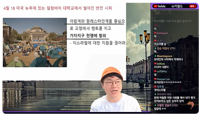 (00:00) [음악] 자 오늘의 마지막 주제는 반전 반 이스라엘 시위에 대한 내용인데요 아 지금 미국 휩쓸고 있어요 반이스라엘 시위가 휩쓸고 있다 4월 18일 날 미국 뉴욕에 있는 콜롬비아 대학교라는 것에서 반전 시위가 펼쳐졌습니다 아무래도 아랍 개하고 팔레스타인 계를 중심으로 했지만 미국인들도 꽤 많았어요 교정에 텐트를 치고 이스라엘이 버리고 있는 가자지구 전쟁에 항의하는 거죠데 미국은 이스라엘 지원을 끊어라라는 반전 시위를 펼쳤는데 원래 콜럼비아 대학교는이 반전 시위로 유명한 대학이라고 합니다 베트남 전쟁 때 이제 반대시위를 주도적으로 한 대학으로 유명하고 남아공의 인종 차별 아니면 이라크 전쟁할 때도 이라크 전쟁 반대시위 이런 반전 대학교를 유명했기 때문에 요런 말이 있습니다 시위가 있을 때마다 컬럼비아는 그곳에 있었다 참고로이 컬럼비아 대학교가 저도 이번에 알았는데 놀라운게 뉴욕 맨하탄에 있대요 와 나탄의 그 대학 들어갈 곳은 되나 우리 친분 뭐 여의도 있는 거 아니야 와이 한가운데
