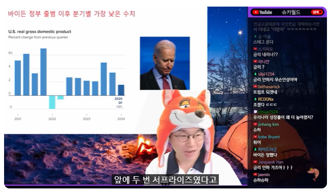 (00:07) 경제 유튜버다 보니까 그래도 나름 이 얘기를 도저히 안 할 수가 없어서 가지고 왔는데 왜냐하면 지난주에 사실 가장 큰 이벤트 중에 하나가 경제 성장률과 PCE, 물가 얘기였는데 미국의 1분기 경제 성장률이 예상보다 낮게 나왔습니다 예상치가 2.4%인데 1.6%로 나왔어요 물론 속보치긴 해도 이 정도면 엄청나게 미스한 거거든요 0.8%포인트니까 뭐지? 이렇게 크게 미스할 수도 있나 싶었는데 굉장히 좀 낮게 나왔습니다 1.6%로 아마 실시간으로 보신 분들이 계실 텐데 순간적으로 시장이 엄청나게 움직이는 걸 한번 보실 수 있을 것 같아요 1.6%는 어떤 거냐 바이든 정부 출범 이후에 분기별 수치로 따졌을 때 요겁니다 요거 가장 낮은 수치 앞에 두 번 서프라이즈였다고 얼쑤x3 하다가 이게 ㅎㅎㅎ 어