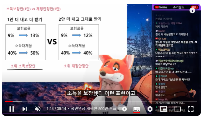 (01:08) 더 내고 더 받기 왼쪽에 있는 게 현재 보험료율입니다 9% 내고 40% 소득대체율을 받는데 보험료율을 13% 올리고 슈카월드에도 한번 나왔죠 소득대체율도 50% 올리자 보험료율도 올리고 소득대체율도 올리자 더 내고 더 받는 소득대체율 올렸으니까 소득을 보장했다 이런 표현이고 2안은 더 내고 그대로 바뀝니다 보험료율만 올리고 국민연금 구멍 난다고 하니까 고갈된다고 하니까 소득대체율을 가만히 두자 그래서 소위 이렇게 하면 재정이 좀 안정된다 그래서 재정안정안이라고 불리고 있습니다 1안이냐 2안이냐 투표를 하는 거예요 아니 1안도 마음에 안 들고 2안도 마음에 안 든다 3안, 4안은 없냐 거기 500인 씩 모였으면 새로운 뭘 제안하면 되는 거 아니에요? 아닙니다 오직 이 두 개에 대해서만 투표를 하게 돼 있었고 그럼 1안과 2안은 어떻게 나왔냐? 단계가 길어요 2022년 7월 물론 옛날에도 있었는데 국회가 연금개혁특별위원회를 출범합니다 국회의원들 분이 중심이 돼 있어요 한 10명분 들어가서 특별위원회를 만든 다음에 국회 내에 그 산하에 민간자문위원회를 구상합니다